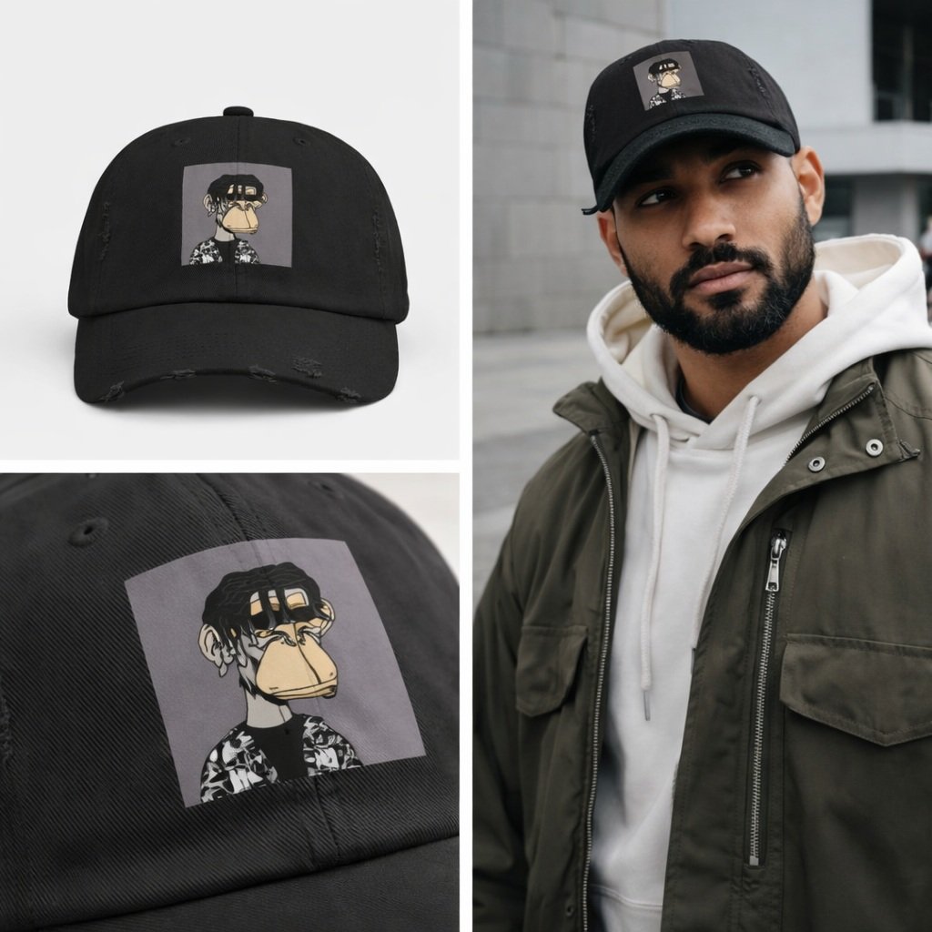 La Gorra Distressed Black – Based Ape Gang #1513 transforma un NFT en una pieza física exclusiva, diseñada para quienes viven y construyen en la cultura Web3.